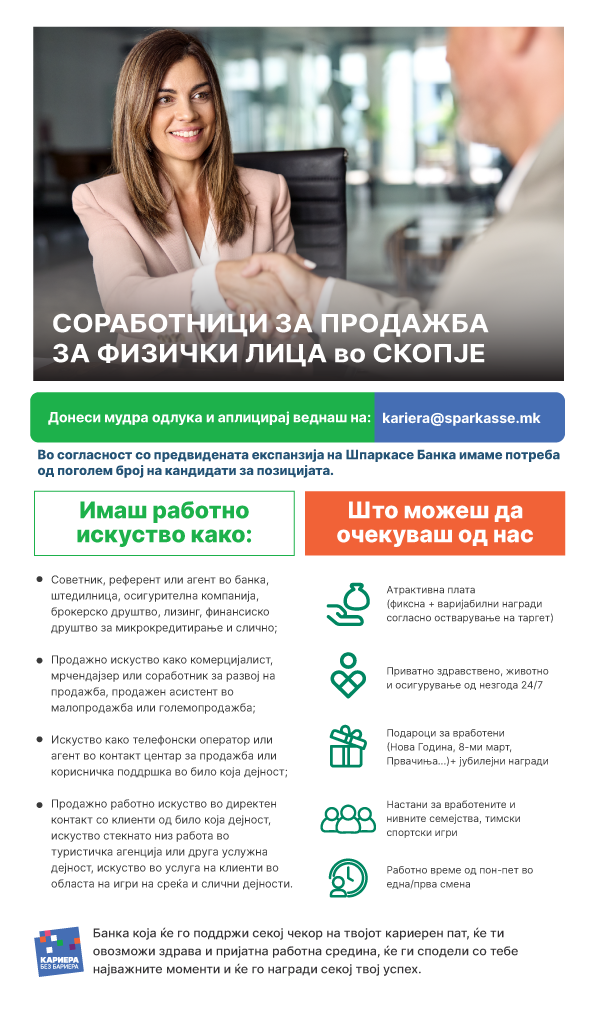 Доколку сте заинтересирани за аплицирање испратете го вашето CV на kariera@sparkasse.mk