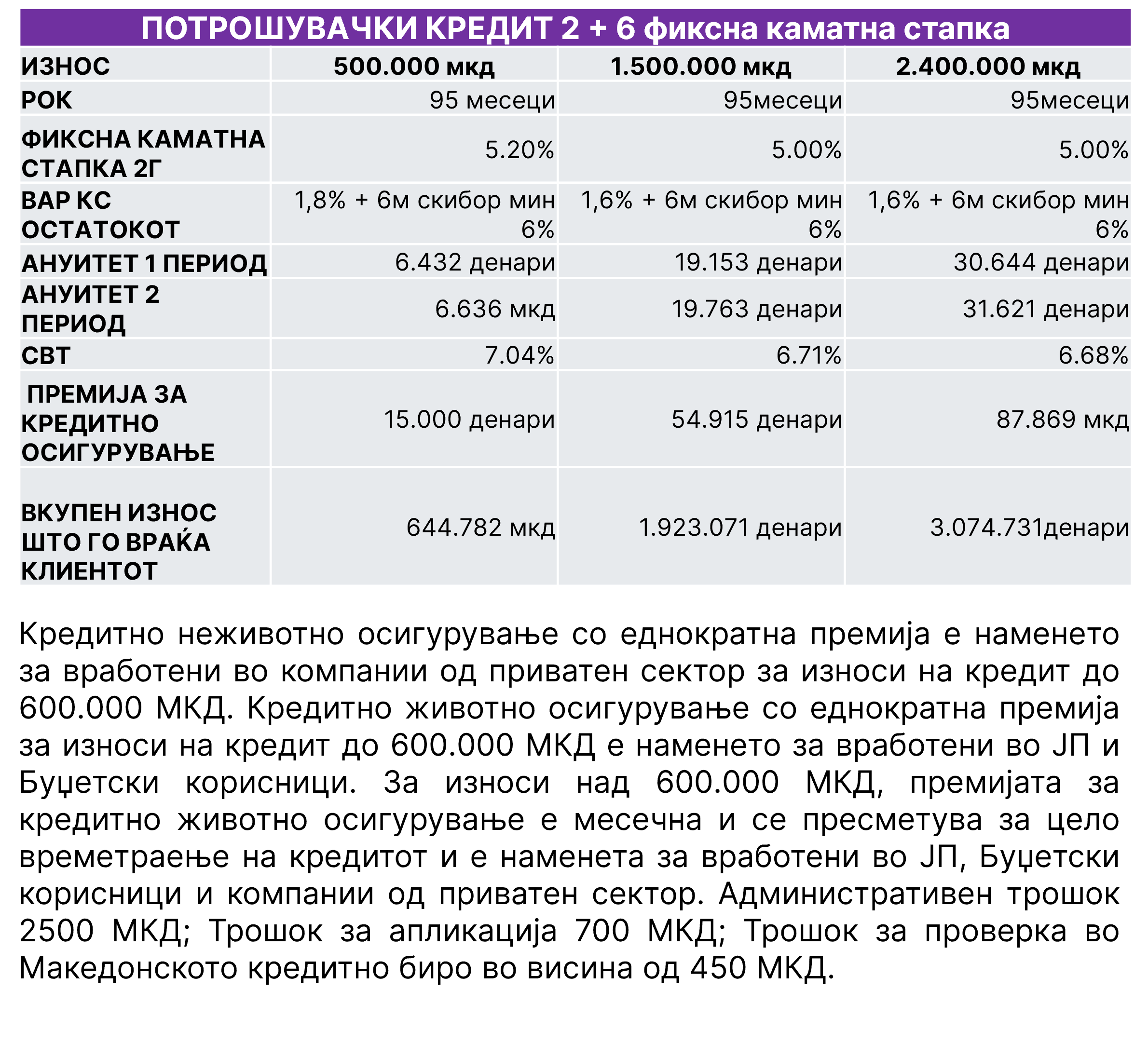 За потрошувачки кредит во износ од 2.400.000 МКД и со рок на отплата од 95 месеци со фиксна каматна стапка за првите две години и вклучено кредитно животно осигурување, СВТ изнесува 6.68%