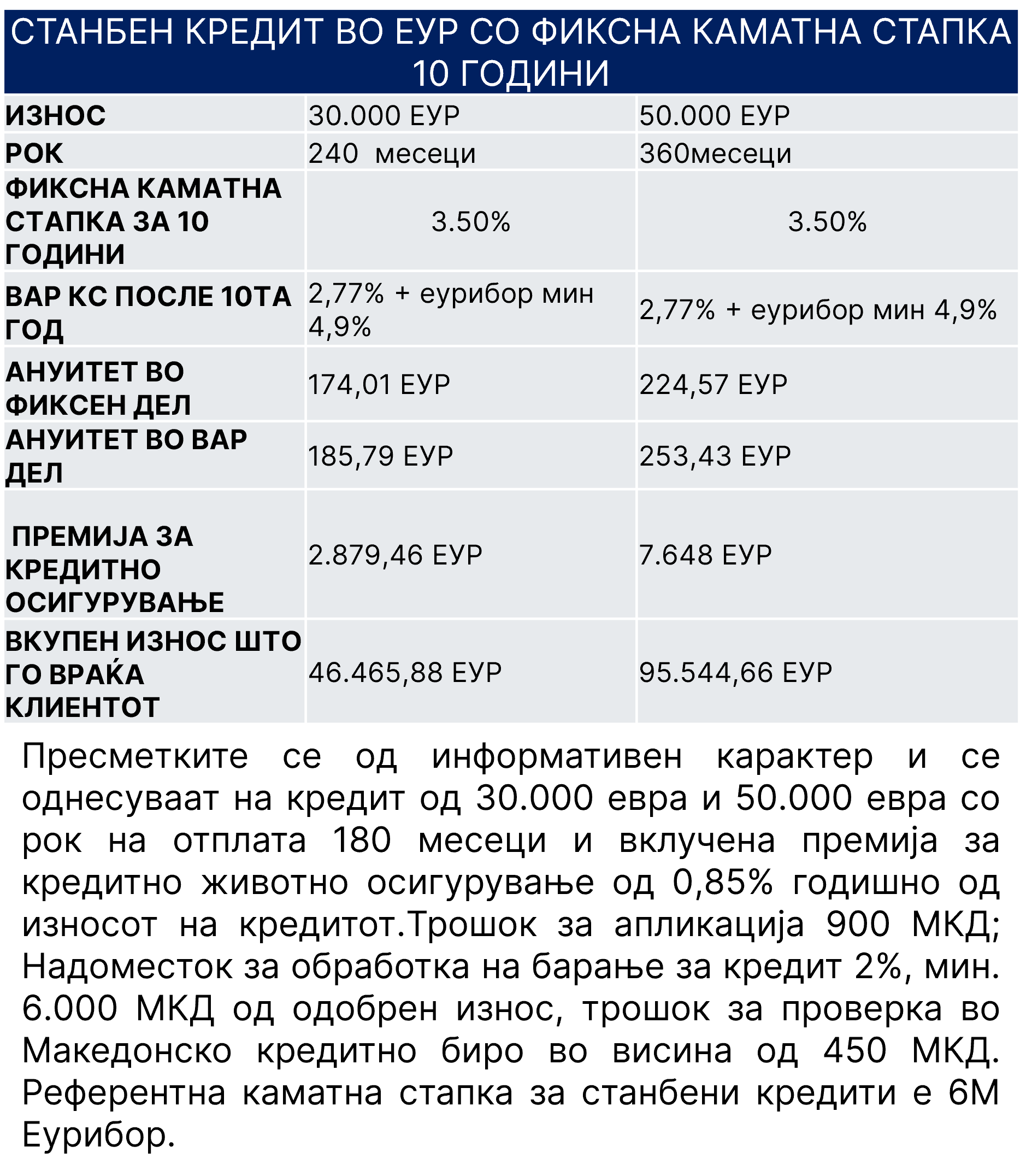 - Фиксна каматна стапка за првите 10 години, почнувајќи од 3,5%